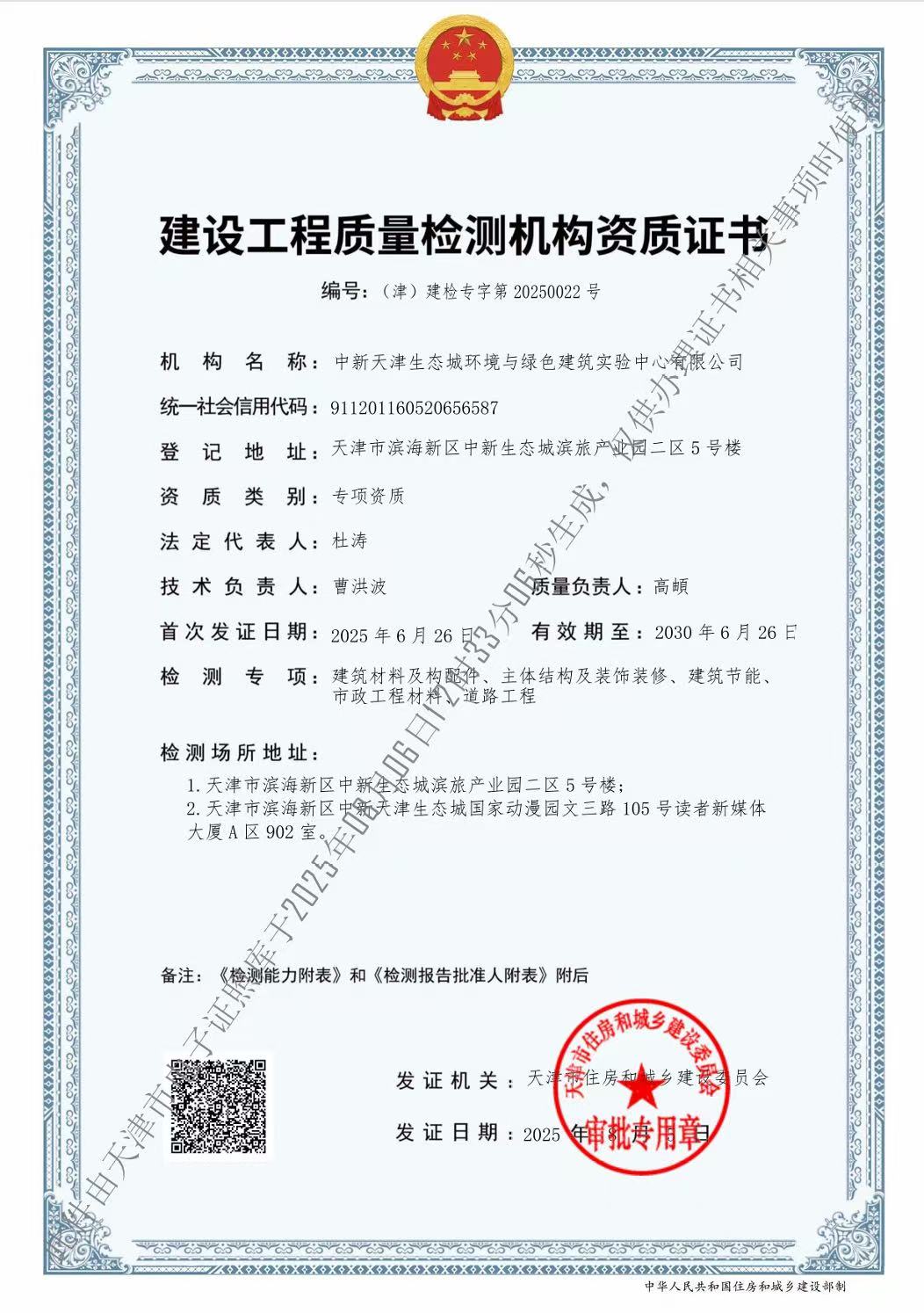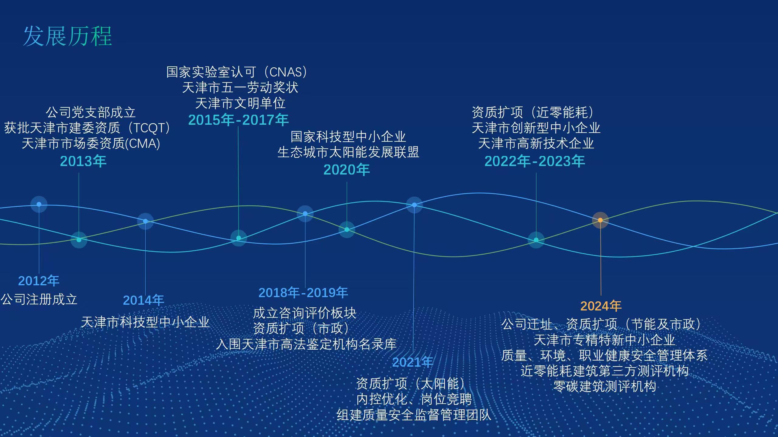 公司發展至今,技術能力不斷拓展和提升?,F已具備檢驗檢測機構資質(簡稱CMA)、天津市建設工程質量檢測機構資質、中國合格評定國家認可委員會實驗室認可資質(簡稱CNAS)等資質。同時,公司已被認定為高新技術企業、天津市專精特新中小企業、濱海新區首家近零能耗建筑第三方測評機構。公司主要從事建筑材料及構配件、主體結構及裝飾裝修、建筑節能、道路工程等檢驗檢測服務,以及綠色建筑節能評估、近零能耗、房屋質量安全鑒定等咨詢服務業務。公司在冊員工為60人,其中高級職稱30名,中級職稱20名,初級職稱10名。